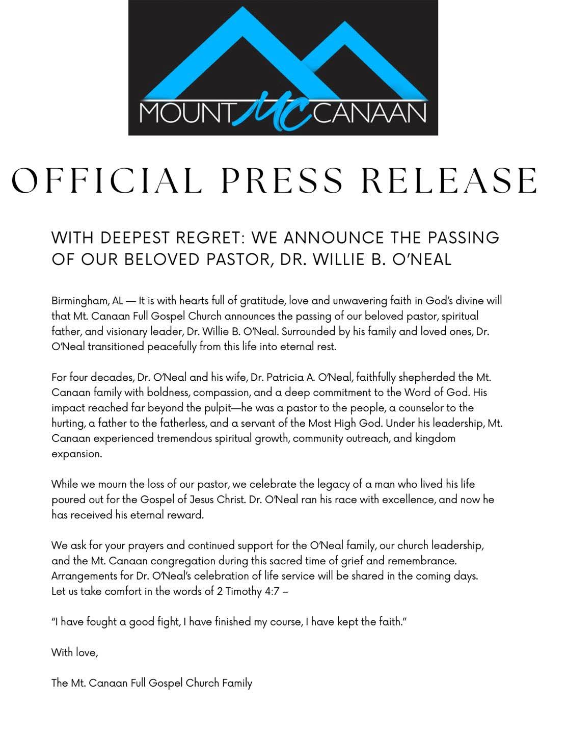 Service details for Dr. O’Neal’s celebration of life will be announced by the church in the coming days. The Mt. Canaan family asks for prayers and support during this time of remembrance.
